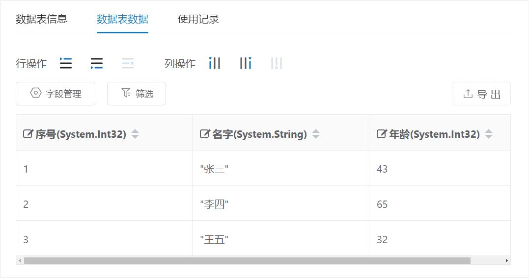 任意点击列表中的数据表,即可查看数据表详情,包括数据表信息、数据表数据和使用记录;