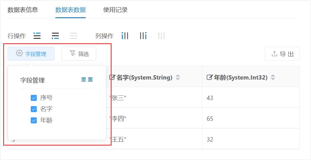 ③点击数据表左上角的 「字段管理」 按钮,即可对数据表中显示字段进行管理。
