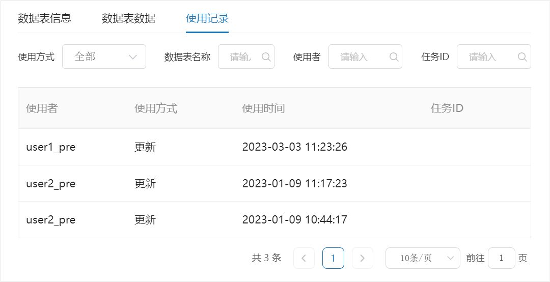 ②支持输入数据表名称、使用者和任务ID进行搜索。