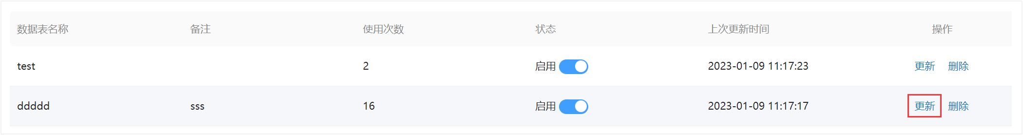 点击数据表操作栏下的 「更新」 字样,即可对已有数据表,进行更新操作,支持更新数据表的数据表名称、备注、人员范围。