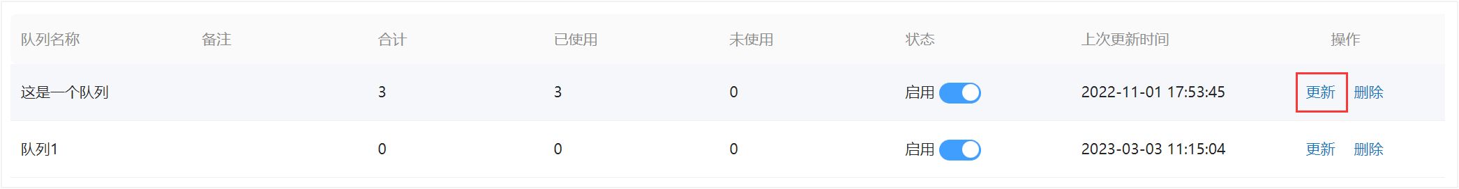 点击队列状态栏下的 「启用」 图标,即可对已有队列,进行启用/禁用操作。